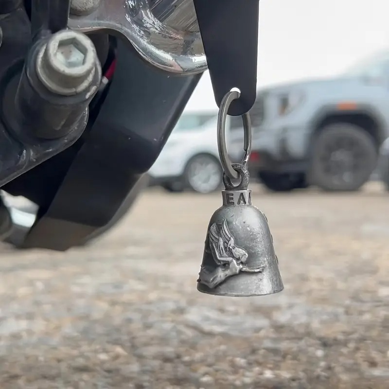 Cuenta la leyenda que esta pequeña campana, colocada en tu motocicleta lo mas cerca del suelo posible, ahuyenta a los malos espíritus que viven en la carretera. Estos espíritus, llamados gremlins, se cuelan en tu moto, causando todo tipo de problemas mecánicos. Al escuchar un sonido agudo de una campana y su constante tintineo los vuelve locos y pierden el agarre hasta caer al suelo. ¿Nunca te habías preguntado como se producen los baches en la carretera?