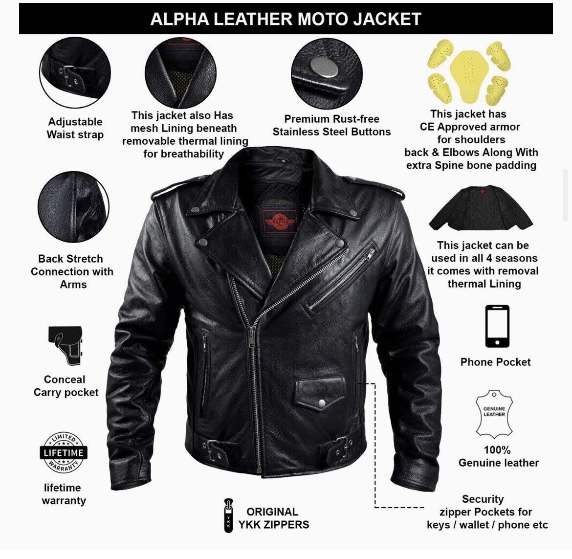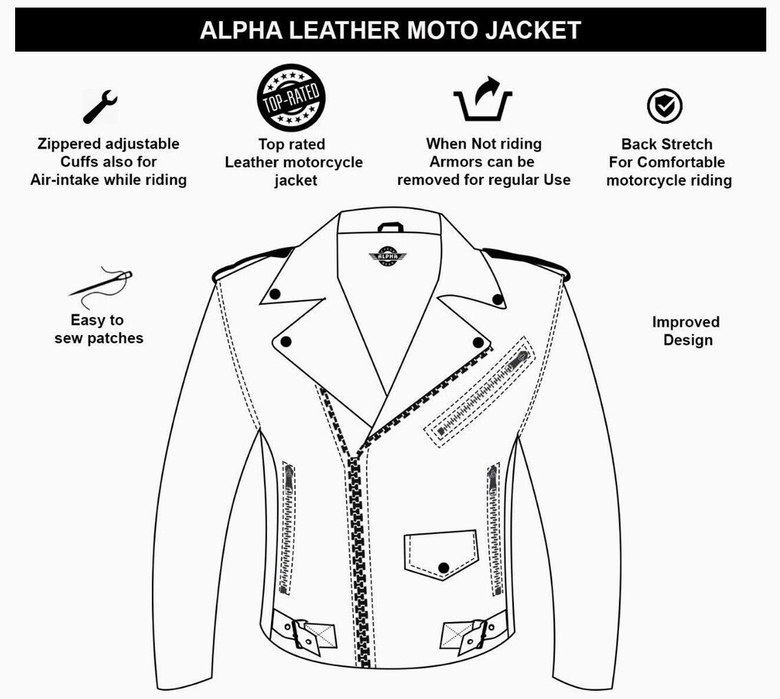 ARMADURA | La chaqueta de cuero Alpha para motocicleta tiene armadura de cuero aprobada. Chaqueta de moto de cuero para hombre con armadura Tiene 5 armaduras (1) Espalda, (2) Hombros y (2) Codos para mayor protección al andar en motocicleta.